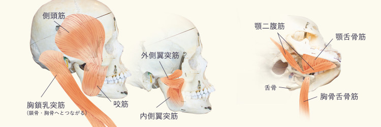 喋るとき、食べるときの口の開け閉めは下顎骨が動きますが、この動きを下顎骨に繋がるたくさんの筋が司っています。発語や咀嚼にはこれらの筋がバランス良く働いて口の開け閉め(下顎運動)をおこなっています。