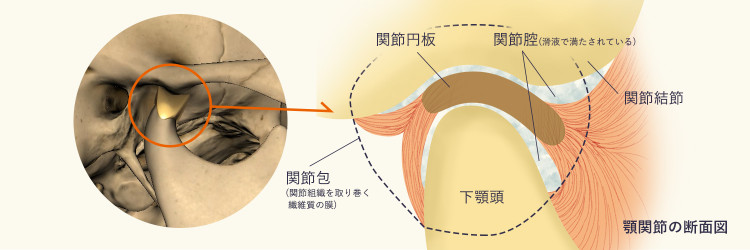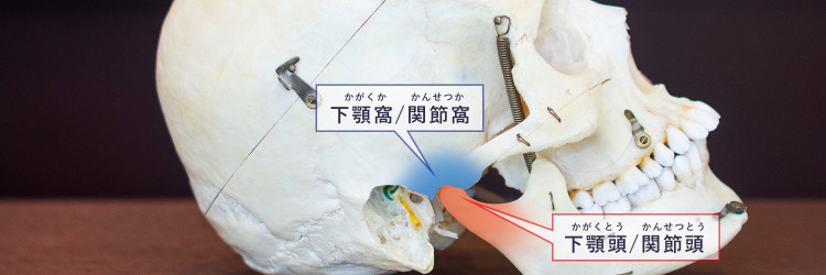 頭蓋骨の側頭骨(そくとうこつ)に下顎窩/関節窩(かがくか/かんせつか)という窪みがあります。この窪みに下あごの上部に出っ張った下顎頭/関節頭 (かがくとう/かんせつとう) が収まっています。
