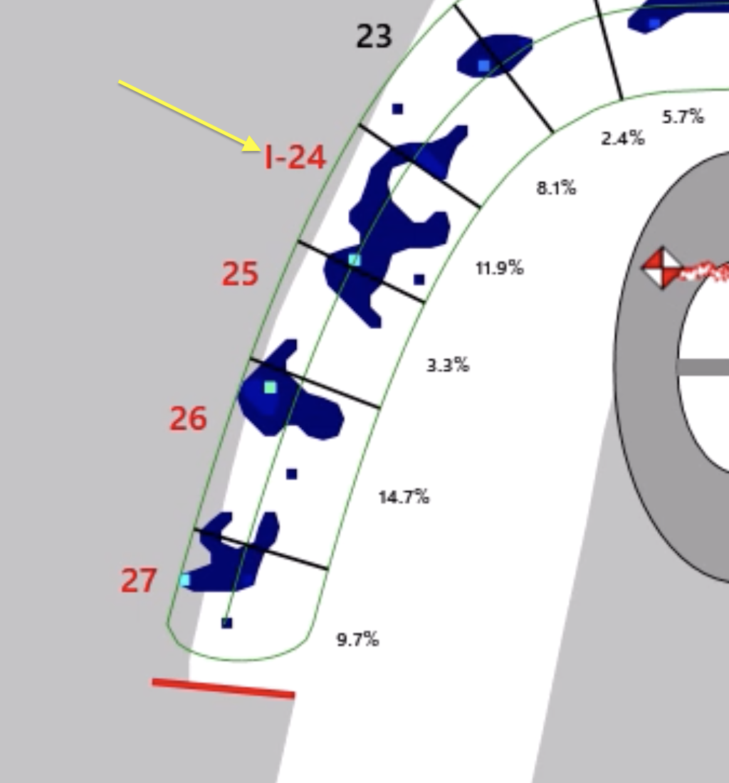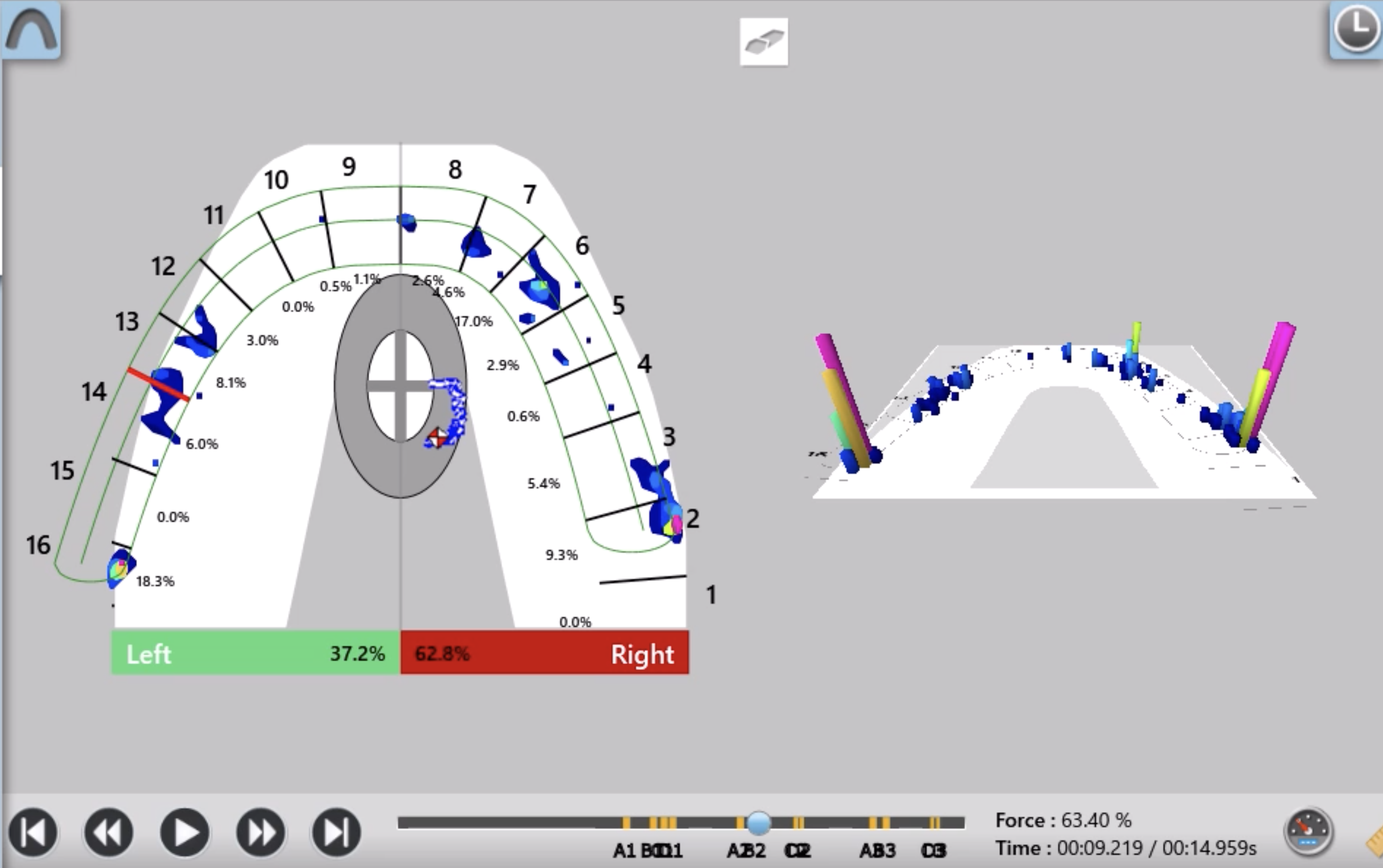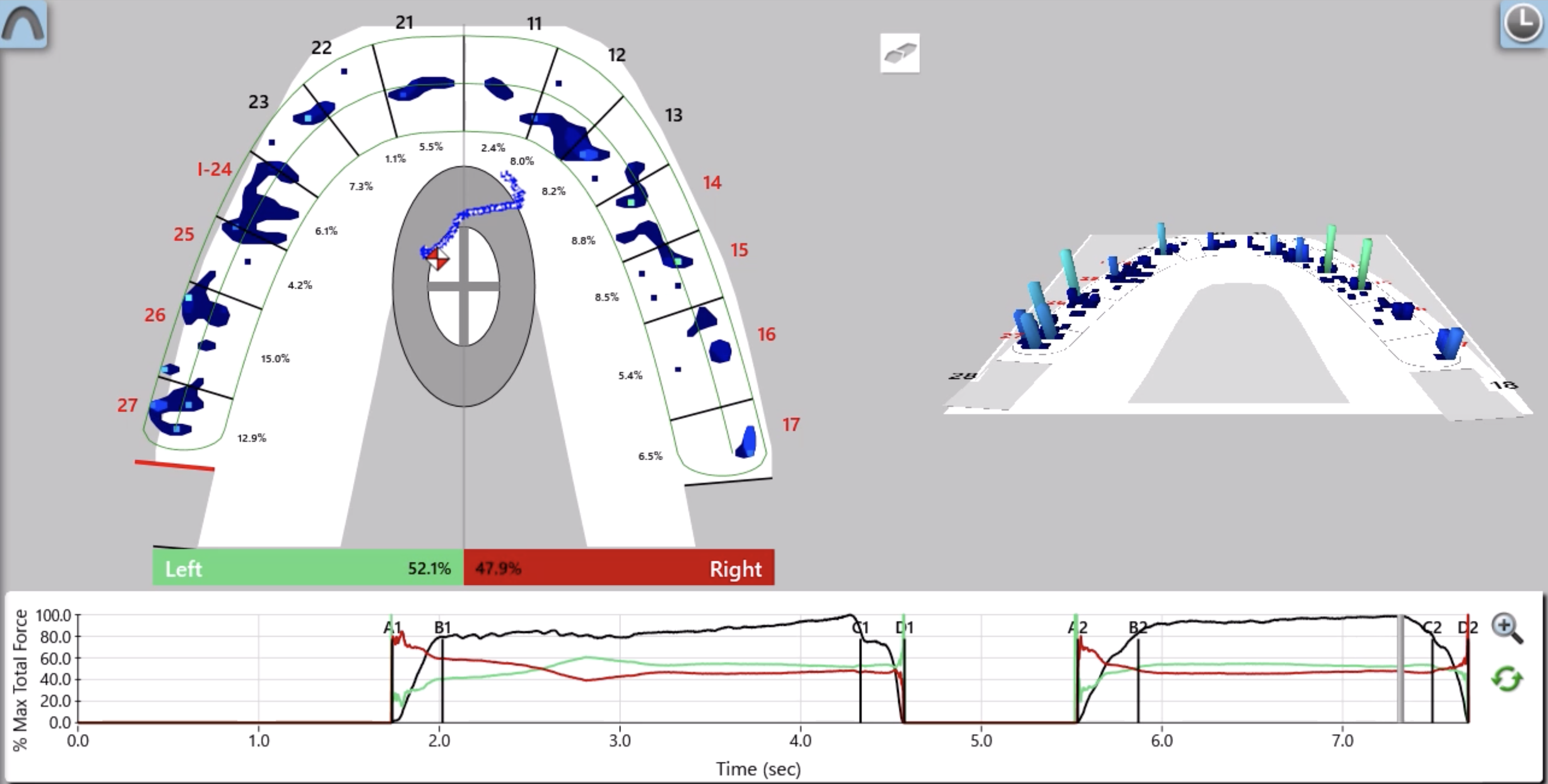 この「T-scan」はインプラント治療にも応用できる点が他の計測装置との違いの一つです。「I-24」と表示されているのはインプラントが埋入されている表記で、そこに他の歯と同じ力が掛かっている事を示しています。これは通常のリボン紙(咬合紙)では全くわかりません。このように天然歯、補綴歯、インプラント治療歯の力の違いを把握すれば、インプラントに掛かる力による治療後のトラブルを回避出来ると考えます。