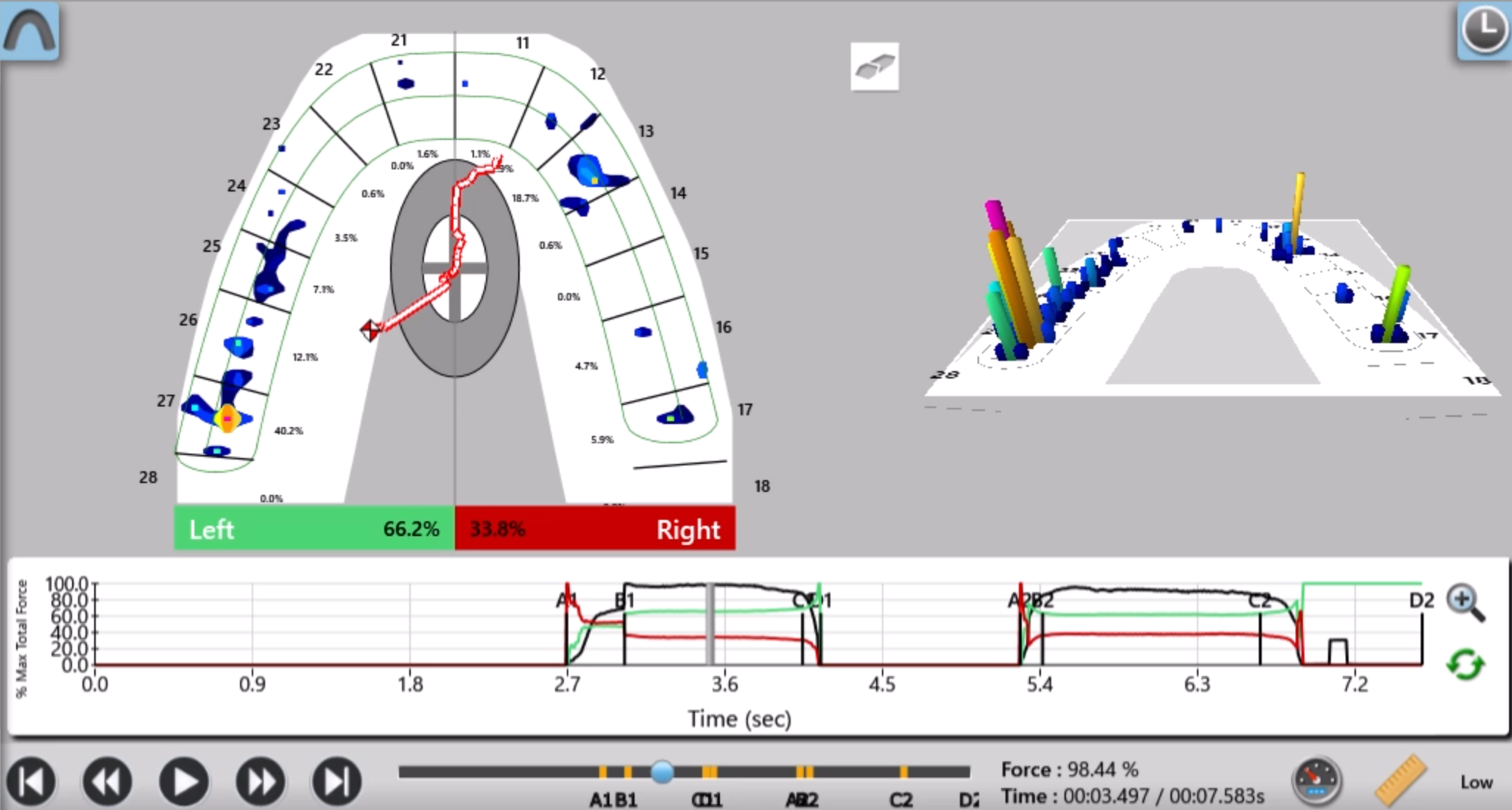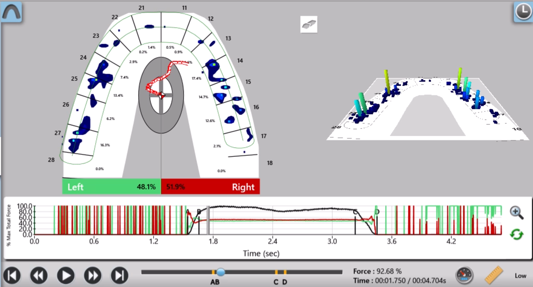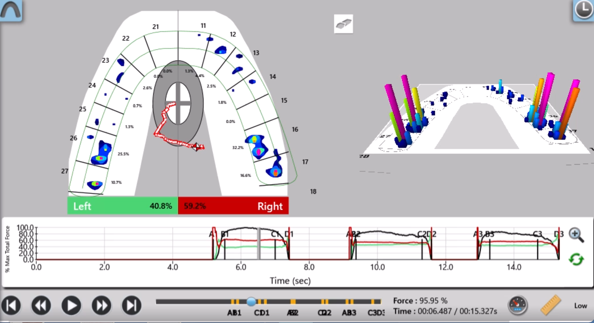 これは T-scan という噛み合わせと、その噛み合わせの力をデジタルで計測して記録する専用機器です。ご覧のとおり奥歯の部分に赤いグラフが塔のように立っていることが分かると思います。このように奥歯に噛む力が(特に右側に)偏っていることを患者さんご自身が目で見て理解できます。