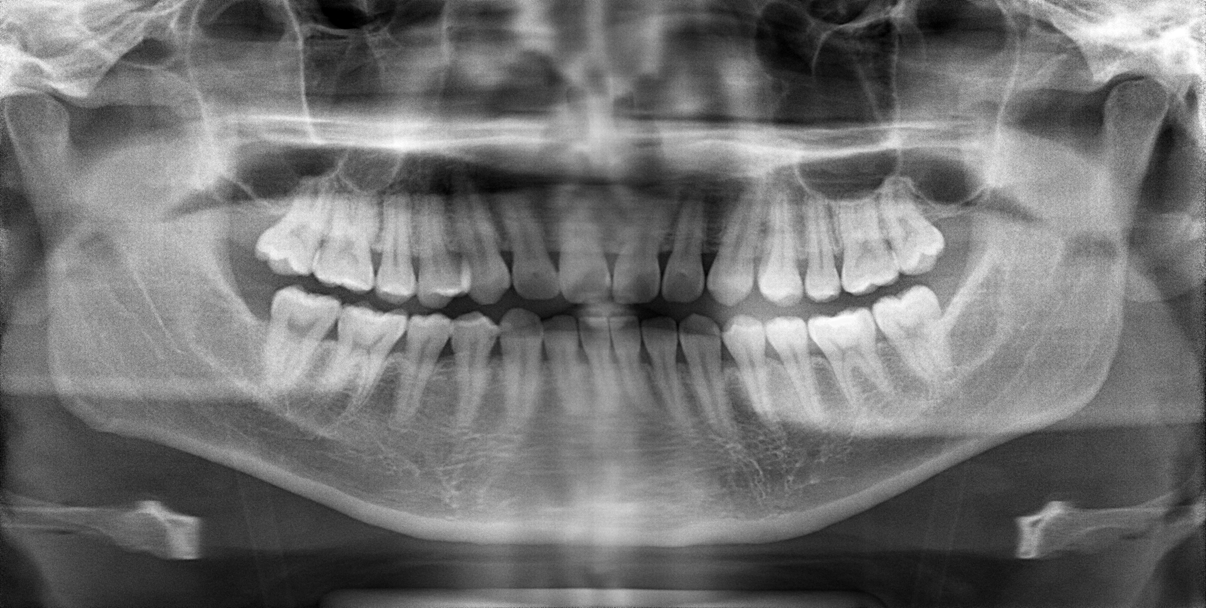 パノラマレントゲン写真ですが、ご覧のおり歯そのものには特に問題ありません。それどころかこの患者さんは素晴らしい歯とお口をしています。全ての歯の神経が残っているんですね。大体、歯医者さんに来る患者さん何処かしら歯の神経を取ってあります。そして健康な歯と歯ぐきも保っている、とてもデンタルIQの高い患者さんということがわかります。