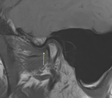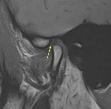 左側の顎関節画像の黄色い矢印は軟骨です。画像診断(読影)をすると顎関節に載っているはずの軟骨が前方にズレでいることがわかります。このように前方にズレることで、咬み合わせに影響が表れます。ただし歯科医院で一般的なレントゲンや CT は原則的に固いもの(骨)を映し出す検査機械ですので、軟骨や筋肉などの軟組織を正しく映し出すことができません。そのために顎関節治療では MRI が不可欠なのです。
